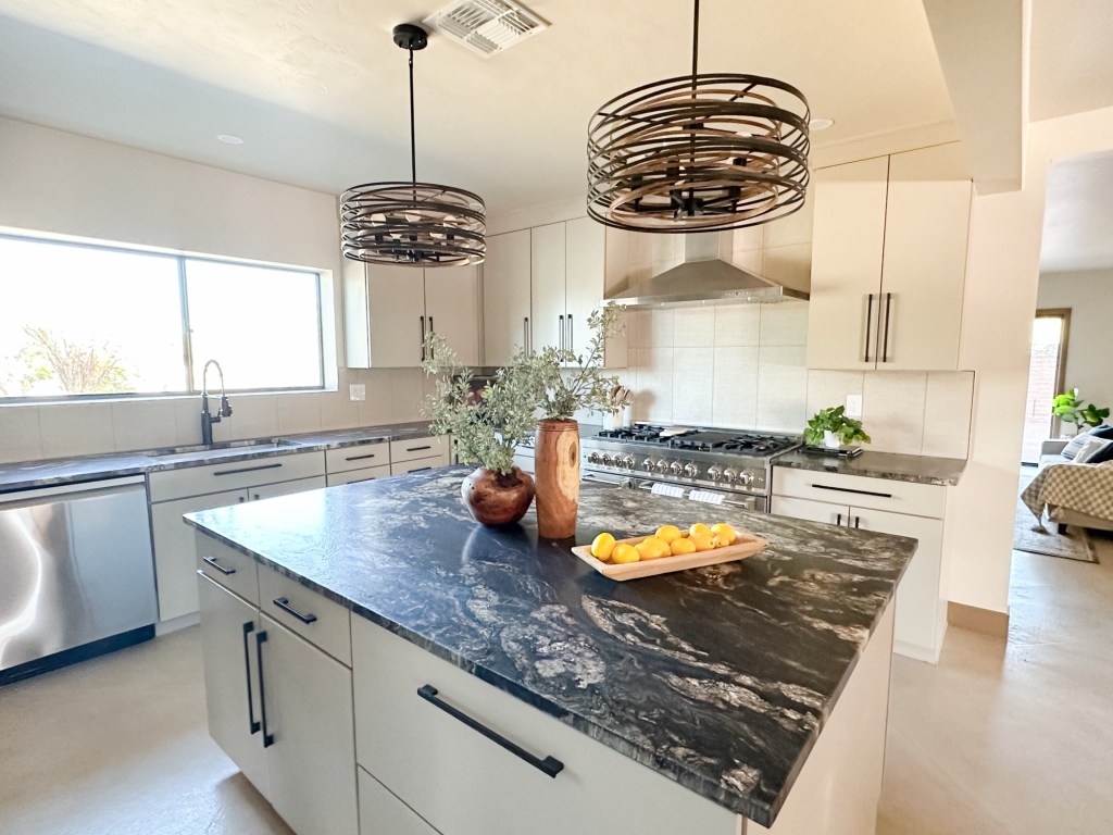 🍋 A chef’s kitchen with a bold stone island, clean cabinetry, and just the right organic accents