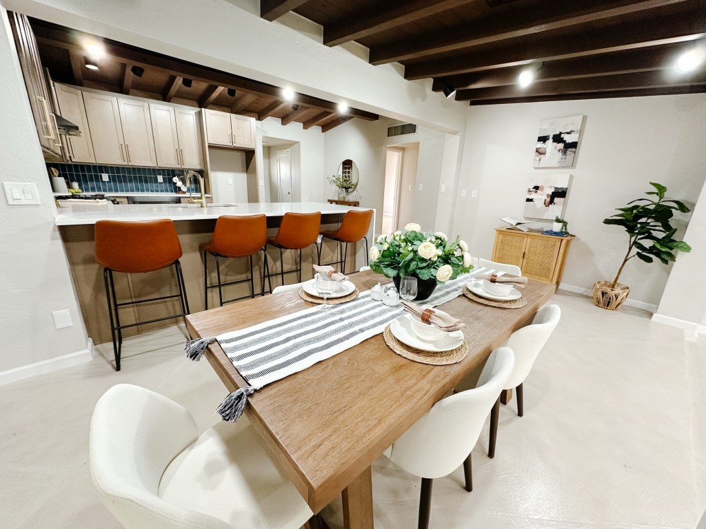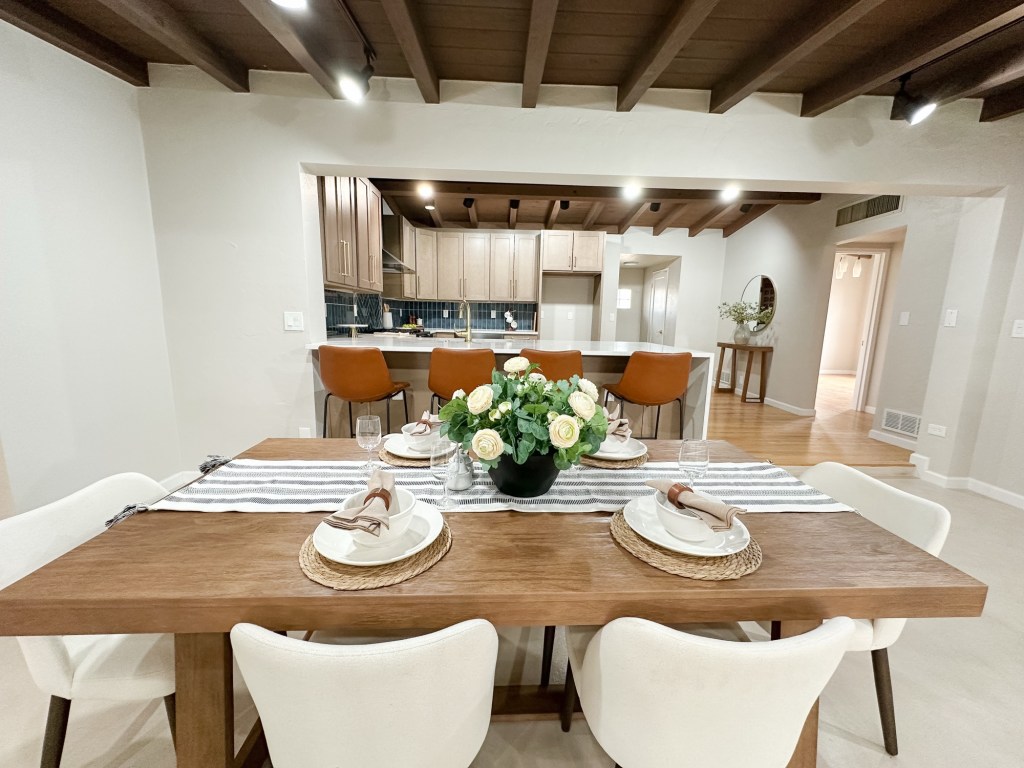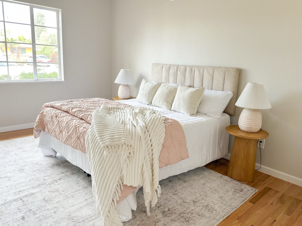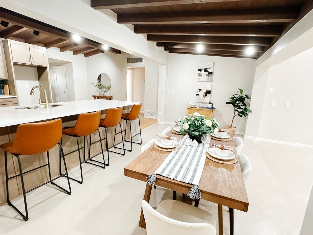 The dining area and kitchen carry that same warmth with leather barstools, clean lines, and natural textures that tie the whole home together. And the bedroom? Soft, serene, and styled to feel like a retreat.