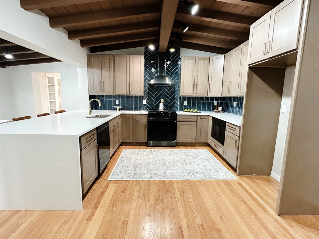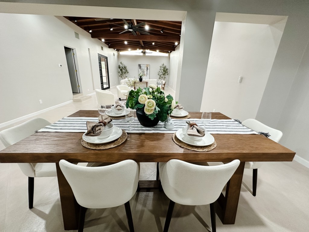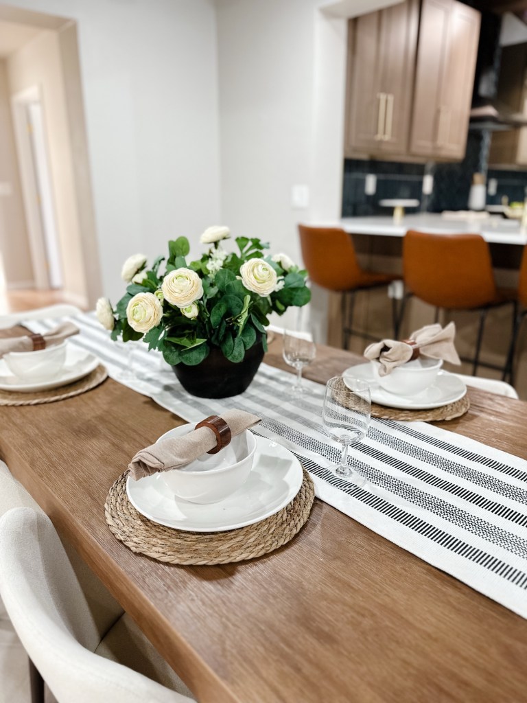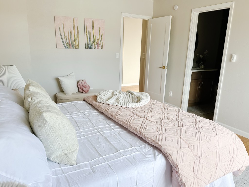 The dining area and kitchen carry that same warmth with leather barstools, clean lines, and natural textures that tie the whole home together. And the bedroom? Soft, serene, and styled to feel like a retreat.