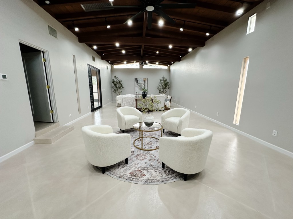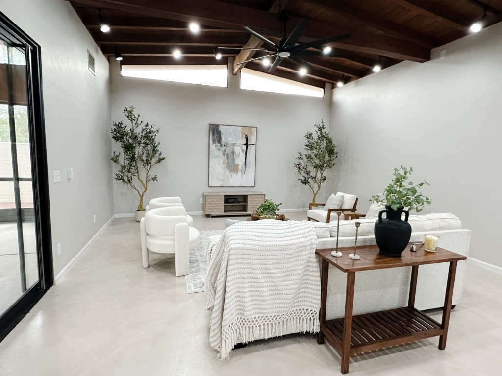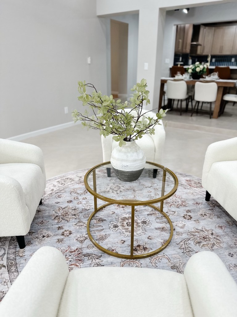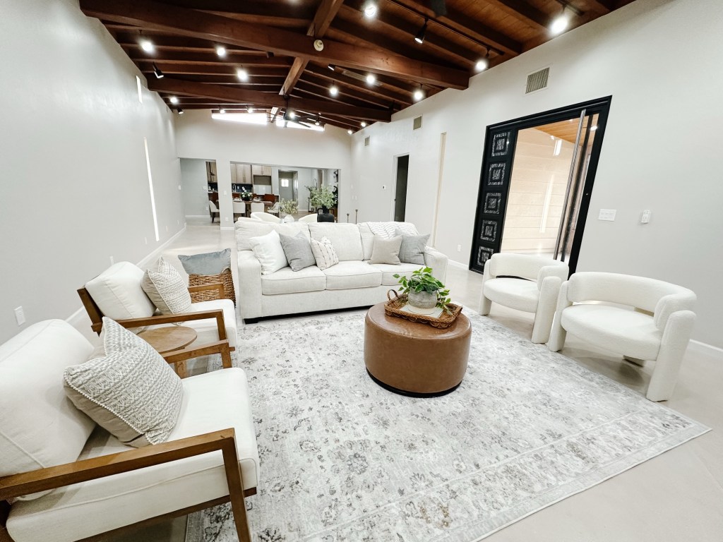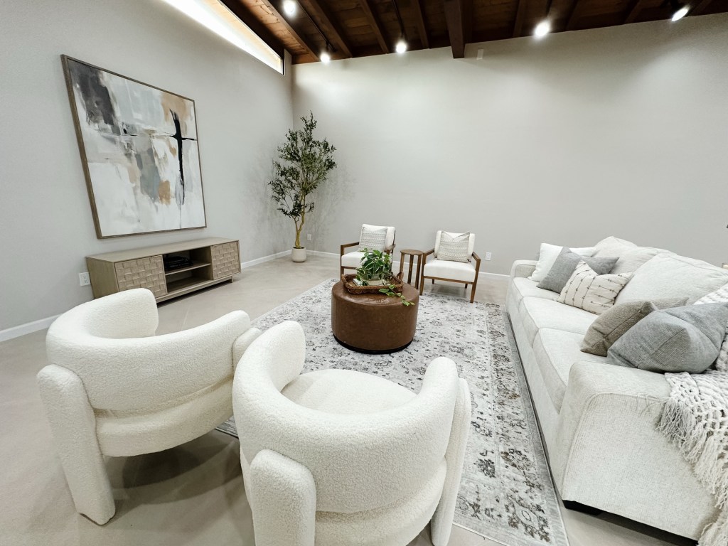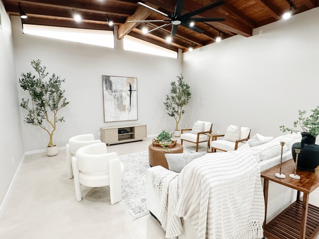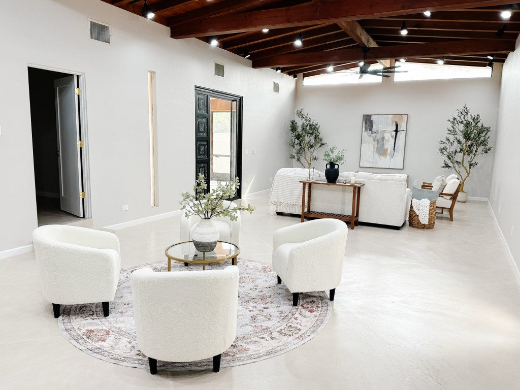🤍 Zone Two: A separate conversational seating area anchored by a round rug and boucle chairs — giving buyers a clear visual of how the room can function beyond just “a big open space.”