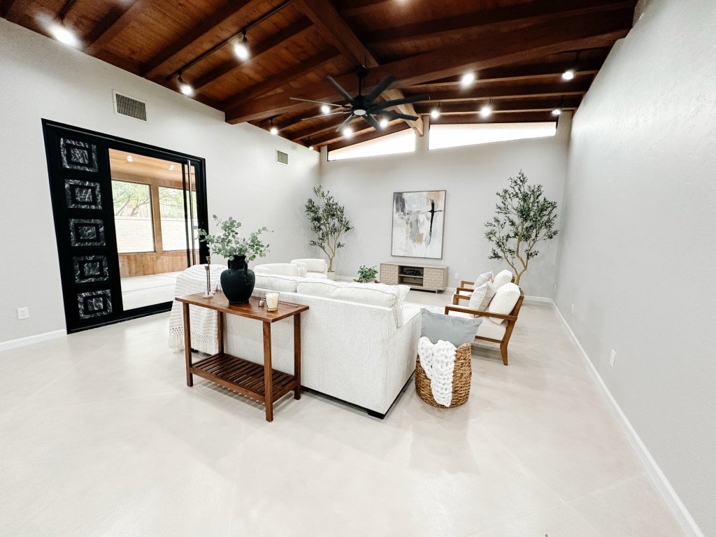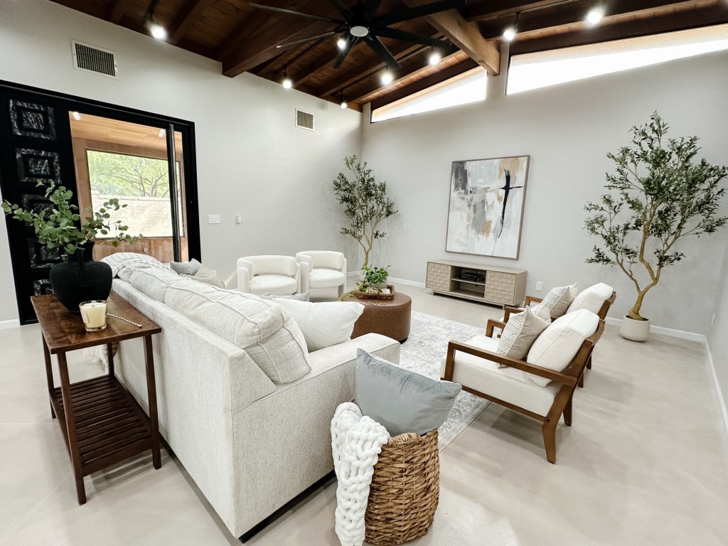 Large great rooms can be tricky. If you under-stage them, they feel cold and cavernous. If you over-stage them, they feel cluttered and awkward. It takes a trained eye in interior design to understand scale, balance, traffic flow, and focal points — especially when architectural elements like exposed beams and long sightlines are involved.